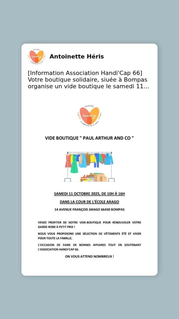 11. octobre 2025 Vide-Boutique Paul Arthur & Co Votre boutique solidaire, située à Bompas, organise un vide boutique le samedi 11 octobre 2025 de 10h à 16h dans la cour de l'école Arago à Bompas. tagPlaceholderCatégories :